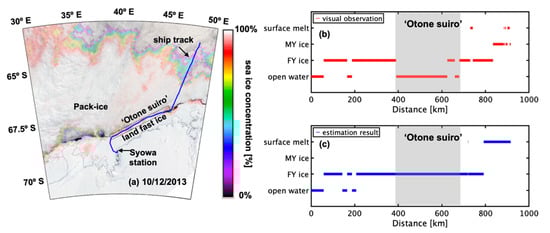 (a) Track of the Japanese ice breaker Shirase from 9 December 2013 to 4 January 2014. (b,c) Comparison of sea ice classification by ship-based visual observations and by this classification algorithm.