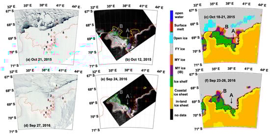 Figure 7a,d shows the MODIS images and Figure 7b,e shows C-SAR images for October 2015 and 2016, respectively. Figure 7c,f shows the results of the proposed ice classification algorithm. Here, the C-SAR images have lines on the edges of the ice shelf, MY ice, and the outer part of the ice tongue, respectively. These lines along the edges of different ice types were defined by analyzing the intensity of reflectance derived from the C-SAR images. Figure 7a–c indicate the season before the large ice breakup, and Figure 7d–f indicate the season after the large ice breakup. From the MODIS images shown in Figure 7a,d, it can be seen that drift ice and land fast ice were separated by flaw polynya, whereas ice types including FY ice, MY ice, ice shelf or ice sheets cannot be distinguished in the south of the flaw polynya. However, these ice types, except FY ice, could be classified by the C-SAR images shown in Figure 7b,e as mentioned above. The ice classification algorithm developed in this study was designed to classify these ice types, which are detected by MODIS and C-SAR, and the results are shown in Figure 7c,f. From Figure 7c, open ice at two offshore regions (33–35° E, 68.3–68.8° S and 38–43° E, 67.5–68.5° S) classified by the proposed algorithm corresponded to open water and newly formed ice, which appeared in the MODIS image at the boundary between drift ice and land fast ice, as shown in Figure 7a. Although the MODIS image shown in Figure 7d cannot distinguish between ice shelves and MY ice, the results of the ice classification algorithm shown in Figure 7f are in accordance with the edge of the ice shelf shown in Figure 7e. Moreover, the MY ice floe at 41.5–42.0° E, 68° S, shown in Figure 7e, was also confirmed. The C-SAR image shown in Figure 7b contained a square-shaped projection of ice shelf at the point indicated by A (38° E, 69.5° S) in 2015. This part of the ice shelf at A in 2015 was broken up in 2016. This change in ice shelf can also be confirmed from the classification results by the algorithm (Figure 7c,f). A MY ice outflow was confirmed around this ice shelf. In the open water, caused by breakup, the area of FY ice grew. This change in ice types was also confirmed by the ice classification algorithm results shown in Figure 7f. At the point indicated by B (35–37° E, 69° S) the breakup and separation of the ice shelf occurred, and many icebergs appeared. These events were confirmed from the C-SAR images. These ice type changes were also confirmed from the ice classification algorithm shown in Figure 7f as a change from an ice shelf to MY (IB) ice. The classification results also indicated that MY (IB) ice appeared at the boundary between the MY ice and the ice shelf.