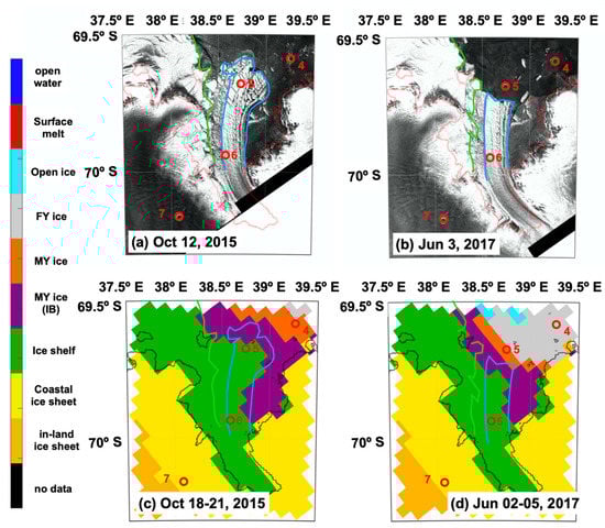 Figure 8 shows the classification results of ice types and an enlarged image of the C-SAR image around the SG ice tongue. Here, the C-SAR images have lines tracing the outline of the ice shelf (green line) and the ice tongue (blue line), respectively. These lines along the edges of different ice types were defined by analyzing the intensity of reflectance derived from the C-SAR images. In 2017, the tip of the SG tongue flowed out as shown in Figure 8b. According to the classification results shown in Figure 8c,d, the ice in location 5 was classified as an ice shelf before breakup, while it was classified as a MY ice after breakup. The shape of the SG ice tongue changed after breakup, as shown by blue lines in Figure 8a,b. The results of the ice classification algorithm shown in Figure 8c,d show good agreement with these blue lines. The calculation results also show that the ice conditions at sea substantially changed after the breakup. A C-SAR image on 5 May 2017 confirmed that new ice started growing in location 5. Therefore, the ice shown in Figure 8b, which was only 1 month after the breakup event, appears to be FY ice. However, the algorithm classified the ice as MY ice because the value of σ0 was within the range of MY fast ice, as shown in Figure 2e. This discrepancy can be explained as follows. It has been reported that the salinity of the sea surface at the glacier edge is lower due to the presence of fresh water from the bottom of the glacier in Greenland [32,33]. Thus, ice formed from low-salinity sea water has lower dielectric loss and a higher σ0 value than ordinary FY ice. A similar effect of low-salinity water from the tip of the ice tongue was likely to have occurred at location 5.
