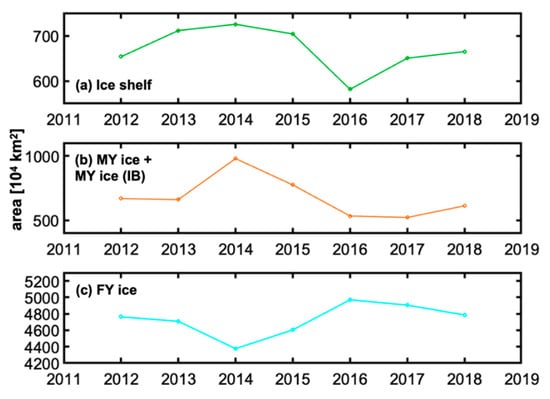 Figure 9 shows the inter-annual changes of the monthly averaged ice area in October for (a) the ice shelf, (b) MY and MY (IB) ice, and (c) FY ice, classified using the ice classification algorithm during the period of 2012 to 2018 in the region of 32–44° E and 67–71° S, including LHB. Hereafter, MY ice and MY (IB) ice are referred to as MY ice for simplicity.