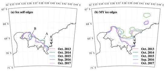 As mentioned above, the areas of the ice shelf and MY ice had decreased during 2014 to 2016. However, there was a difference in the areal decrease. We focused on the ice edge to further study this difference. Figure 10 shows the ice edge of (a) the ice shelf and (b) MY ice, derived from the ice classification algorithm in October from 2013 to 2017.