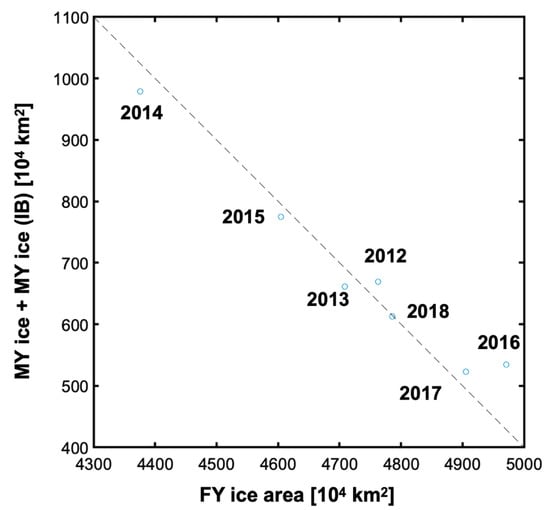 Figure 9 shows that the area of FY ice exhibited a mirrored pattern of MY ice, i.e., when the MY ice area was large, the FY ice area was small, and vice versa. This pattern can be seen in Figure 11 from a different perspective. The figure shows a comparison of the areas of FY ice and MY ice. There was a negative correlation between these ice types. Based on this relationship, it may be possible to show that MY ice was replaced by FY ice when ice breakup occurred. Conversely, FY ice developed into MY ice and extended seaward until an ice breakup event. Periodic breakups have been reported in LHB from 1980 to 2004 [17], and such ice breakups were reflected in the results of the current study. Importantly, the proposed ice classification algorithm was proven to be able to detect ice breakup events as quantitative changes in the distribution and ice type in a given area.