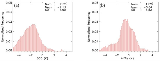 To set the initial thresholds for each test element, the frequency analysis of the test elements over the fog was performed using the 1728 scenes from the training cases. Fog pixels were selected using the co-located visibility meter data and visual inspection. Figure 5 shows the frequency distribution of the three test elements according to day and night on land. The average DCD was −2.7 K, and most DCDs were less than 0 K (98%) during nighttime (Figure 5a). Pixels above 0 K were mainly found in sub-pixel-sized fog. ΔFTs showed a non-negligible difference between day and night (Figure 5b,d). Most ΔFTs during the nighttime were greater than 0 K (Figure 5b); however, most ΔFTs during daytime were less than 1 K (Figure 5d). This could be due to diurnal variation in the temperature profile at the boundary layer, strong inversion during nighttime, and the lapse rate profile during daytime. Most ΔVISs were greater than 3%, with some reaching 25% (Figure 5a). Fog pixels with ΔVISs less than 2–3% were the cases with sub-pixel-sized fog or weak fog or limitation of the visibility meter. The distribution of the histogram in each test element appeared broad due to the complexity and diversities in the fog and background. The initial threshold values determined from the frequency analysis were statistically optimized using iterative sensitivity tests. The optimized threshold values were selected when KSS was maximum.