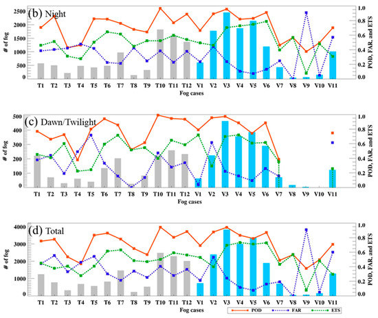 Validation results for the training (T) and validation cases (V) with ground-observed visibility data according to the time ((a) day, (b) night, (c) dawn/twilight, and (d) total). Red, blue, and green lines with dots indicate POD, FAR, and ETS for each fog case, respectively. The bars represent the total number of fog points used for validation. The gray and blue bar graphs are used to distinguish between training and validation cases.