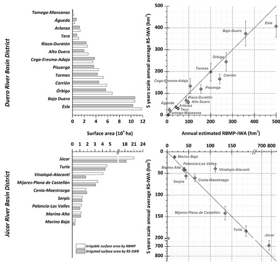 Comparison between the irrigable and irrigated surface areas (left column) and annual estimated RBMP-IWA and RS-IWA over different ESs from the Duero and Júcar RBDs (right column).