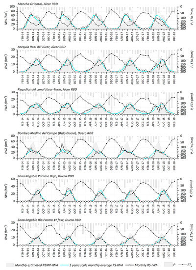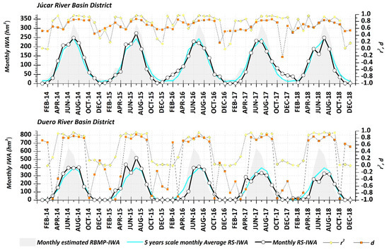Both time series for the 5 year scale monthly average RS-IWA and the Monthly RS-IWA follow similar monthly temporal patterns in their monthly estimated RBMP-IWA. In that sense, the maximum values are observed in spring or summer, while the minimum values occur in autumn and winter. However, for both RS-IWA time series, underestimations are common for all the years, especially in summer, while for some spring and autumn months, higher values were estimated. These values reflect time series decoupling for autumn in both RBDs, which is clearer in the Duero RBD, where higher monthly RS-IWA values are constant over the 5 years; therefore, the 5 year scale monthly average RS-IWA reflects this overestimation. Conversely, in the Júcar RBD, slight overestimations occur in spring.