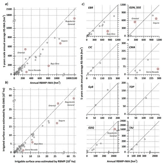 For the 69 ESs that belong to the 11 RBDs studied: (a) the 5 year scale annual average RS-IWA evaluation against the RBMP-IWA, (b) the irrigable and irrigated surface area comparison, and (c) a magnification of Figure 6a according to the RBD for the 5 year scale annual average RS-IWA evaluation against the annual estimated RBMP-IWA for each ES (except for the Júcar and Duero RBDs, as presented in Figure 2).