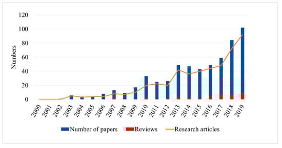 According to the Web of Science statistics, there are 651 relevant papers from 1990 to 2019 when “plant disease” and “hyperspectral” are used as the key words to search for in “all databases.” After screening and statistical analysis, Figure 1 shows that the number of plant disease research articles with hyperspectral techniques has risen sharply in the last 20 years (there were no articles before 2002). However, there are only 35 reviews. Bock et al. [23] first provided a statistical overview of the common disease severity assessment error sources and traditional visual assessment methods. Then, the authors described in detail two non-invasive disease severity assessment techniques—digital imaging and hyperspectral imaging—from their history, principles, and sensors to their data analysis processes, algorithms, and application directions. Finally, the advantages and disadvantages of these techniques were summarized. All of the analyses in this review are comprehensive. Unlike the research of Bock et al. [30], the overview of Thomas et al. [28] is only aimed at hyperspectral imaging. They overviewed the advantages and limitation of hyperspectral sensors from the laboratory to field applications and discussed the possibilities and challenges of hyperspectral measurements at different scales.
