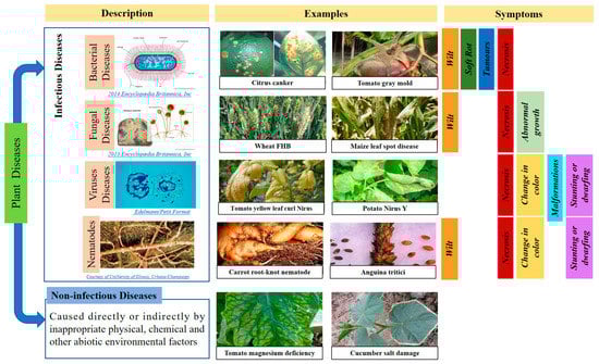 Based on the causal agents, the tens of thousands of plant diseases worldwide can be divided into two categories: infectious and non-infectious diseases [36]. The detailed classification system and disease examples are shown in Figure 2. Among them, non-infectious diseases are directly or indirectly caused by inappropriate physical, chemical, and other abiotic environment factors. The excess, deficiency, or improper balance of light; air circulation, water, or essential soil elements; unfavorable soil moisture–oxygen relations; high or low temperatures; pesticide injury; and many other external factors are the main disease-causing agents. The blossom-end rot of tomatoes and pepper, which is caused by wide fluctuations in soil moisture and temperature levels, is a typical and prevalent non-infectious disease.