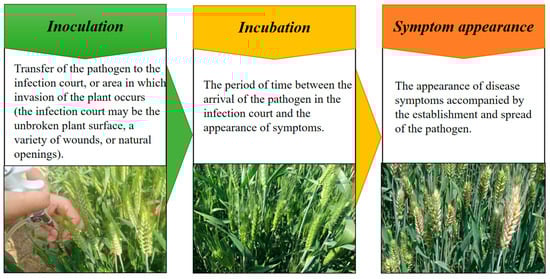 The infection with a pathogen is a dynamic process. Toxins, enzymes, and extracellular polysaccharides and other substances are all produced and changed in interacted process with the host plant. Except for the pathogen and plant connection stage, Figure 3 shows the three fairly distinct and significant stages of plant–pathogen interaction: inoculation (the pathogen invades the host), incubation (the latency period, in which the pathogen is parasitic in the plant), and symptom appearance (the plant shows disease symptoms and new pathogens may be produced). Each stage often leads autonomously to the next, once pathogenesis has been triggered by the pathogen [38,39]. Not only do the physiology and biochemistry of the host plant change in this dynamic process, but some pathogens change as well. Thus, the entire process is very complex.