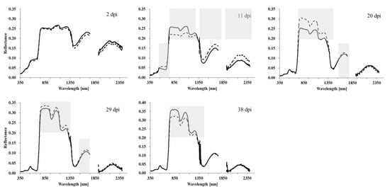 Effect of the yellow rust development on the spectral reflectance of winter wheat as days post inoculation (dpi) increase. Gray areas in the reflectance images (lower) indicate significantly different spectral ranges between the inoculated (dotted black line) and non-inoculated (solid black line) leaves.