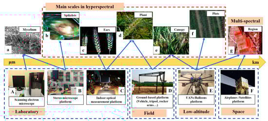 Preceding detailed data analysis, data acquisition is the first and important step in any hyperspectral image-based plant disease analysis. Different platforms and their combinations with different sensors can form different hyperspectral measurement systems. For the purpose of plant disease research, choosing a suitable data measurement system is a prerequisite for obtaining accurate results. Figure 5 shows platforms and their corresponding observation scales. From the cell and tissue scale to the region and landscape scale, the corresponding HSIs of each scale have many choices. Sensor performance and spatial resolution requirements need to be considered simultaneously when constructing hyperspectral measurement systems.