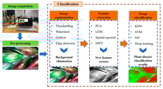 Image classification in hyperspectral image-based plant disease analysis includes techniques that classify data into a healthy category and different pathogen or disease severity categories. The aforementioned image segmentation and feature extraction methods are generally performed to improve the efficiency of data analysis, which may not always be necessary in plant disease detection. However, image classification is not a negligible step.