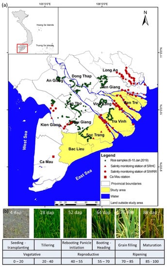 - Wassmann, R.; Phong, N.D.; Tho, T.Q.; Hoanh, C.T.; Khoi, N.H.; Hien, N.X.; Vo, T.B.T.; Tuong, T.P. High-resolution mapping of flood and salinity risks for rice production in the vietnamese mekong delta. Field Crops Res. 2019, 236, 111–120. [Google Scholar] [CrossRef]