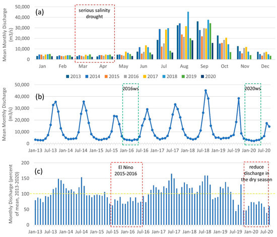 Mean monthly discharge from 2013 to 2020 at Kratie station (12.483°N, 106.016°E) on the Mekong River in Cambodia. In which: (a) Mean monthly discharge; (b) Series data of mean monthly discharge; (c) Monthly discharge (percent of mean). Data source: Mekong River Commission [34].