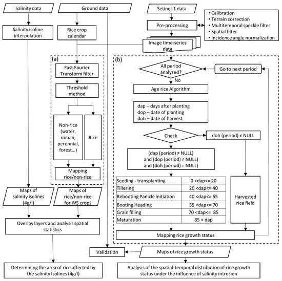 Processing flowchart to evaluate the spatiotemporal distribution patterns of growth stages and rice-planted areas, indicating the mapping algorithm for rice/non-rice (a) and rice growth status (b).