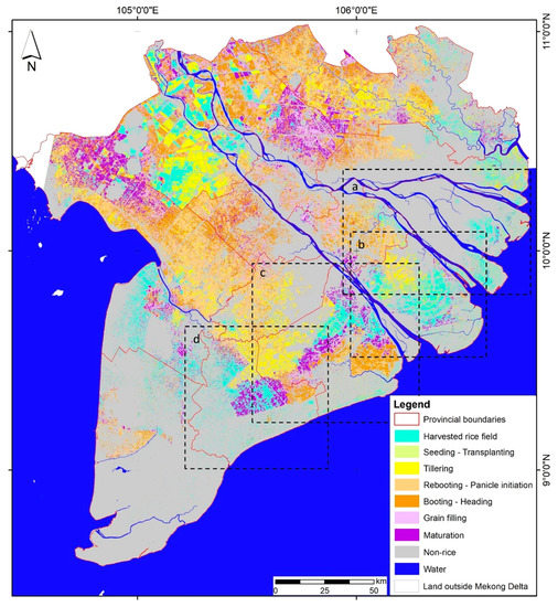 Spatial distribution of rice growth stages in the MD on 13 January 2019. Box a: Bến Tre, b: Trà Vinh, c: Sóc Trăng, and d: Bạc Liêu.