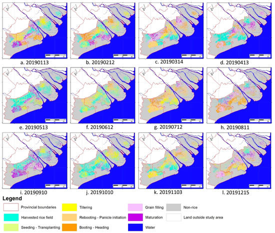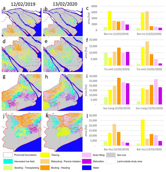 Spatial distribution of rice growth status patterns in 12 February 2019 and 13 February 2020, and the rice area corresponds to the growth stages in the four provinces: Bến Tre (a–c), Trà Vinh (d–f), Sóc Trăng (g–i), and Bạc Liêu (j–l).