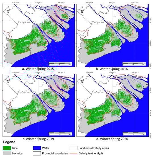 Under these circumstances, the Ministry of Agriculture and Rural Development (MARD) of Vietnam has ratified a project on the development of rice production in the MD up to 2025, together with the vision for 2030 under climate change adaptation plans [14]. This project aims to decrease the overall paddy planted area in the MD from 4 million ha in 2025 (with a production of 23–24 million tons) to 3.8 million ha in 2030 (with 22–23 million tons). To reduce and adapt to salinity intrusion, the project divides the arable land affected by salinity into two categories: (a) less than 4 g/L and (b) higher than 4 g/L, for which different land use planning will be applied and rice crops will be restructured in different provinces. In areas where salinity is higher than 4 g/L, it is planned to have one paddy crop with brackish water shrimp farms [14]. This ambitious project requires detailed information and sound scientific basis to determine how salinity intrusion affects the spatial pattern and the temporal evolution of rice crops in the MD. In this regard, an indispensable piece of information is the spatiotemporal distribution of the paddy land.