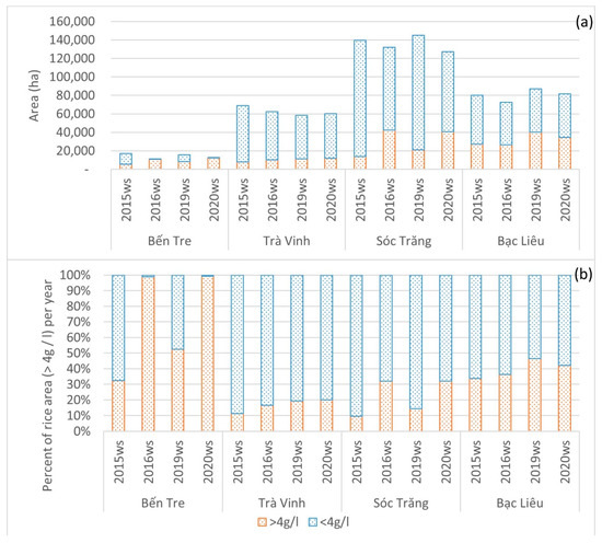 Data analysis allowed us to assess the influence of salinity intrusion on WS seasons for each province, as presented in Figure 11. Figure 11a also shows the rice area affected by salinity (>4 g/L) in 2015, 2016, 2019, and 2020, and the corresponding percentages per year (Figure 11b). The results show that the rice area in Bến Tre province was regularly affected by salinity intrusion (greater than 30%, and in 2016 and 2020 affecting over 95% of the rice-growing area). The rice area in Trà Vinh affected by salinity intrusion was about 17% in 2016 and 20% in 2020. Similarly, the rice area in Sóc Trăng province was also affected by salinity intrusion with less than 15% in 2015 and 2019, and up to 32% in 2016 and 2020. Results indicate that in Bạc Liêu province, around 33–47% of the rice-growing area was affected by salinity intrusion. Unlike other three provinces, Bạc Liêu province displayed an opposite trend in the years 2019 and 2020, in which the area of rice affected by severe salinity intrusion in 2020 was smaller than the previous years. This can be explained by the fact that some areas that were frequently affected by salinity intrusion no longer cultivate rice, so the rice area decreases during the year with the severe drought warned. In summary, results have shown that the provinces in the study area were frequently affected by salinity intrusion and were often affected more widely in severe drought years.