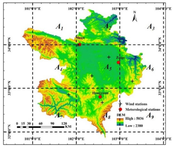 Digital elevation model (DEM) of the Zoige wetland, China. Three meteorological stations (red dots) and six wind measurement sites (black crosses) are identified.