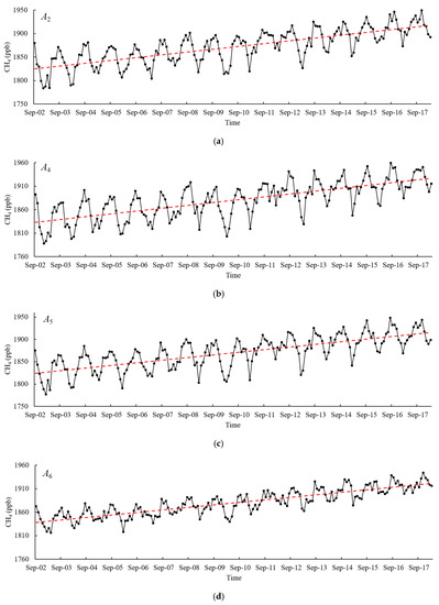 The time-series of the atmospheric CH4 concentrations over A2, A4, A5, A6, A7, and A8 were studied individually. Figure 2 demonstrates an annual cyclic pattern and a persistent increase in the CH4 concentrations at the Zoige wetland during 2002–2018. In the figure, each dot is one observation or one month. A linear fit line was added and is shown as a red, dashed line. The parameters of the linear fit lines over the six cells are listed in Table 2. The slopes of the lines are between 0.015 and 0.017 ppb/day. With each fit line, the atmospheric CH4 concentrations in September of 2002 and March of 2018 were calculated. The concentration values ranged from 1811.357 to 1854.134 ppb in September of 2002 and from 1901.917 to 1944.989 ppb in March of 2018. The increases, after nearly 16 years, were 96.220, 90.560, 90.560, 84.900, 84.900, and 84.900 ppb in A2, A4, A5, A6, A7, and A8, respectively. The average annual rate was 5.7 ± 0.3 ppb/year. The globally averaged annual rate was 5.1 ± 0.6 ppb/year using the marine surface data between 2002 and 2017 (E. Dlugokencky, National Oceanic and Atmospheric Administration (NOAA)/Earth System Research Laboratory (ESRL), https://www.esrl.noaa.gov/gmd/ccgg/trends_ch4/). Regarding the global data, an increase in the atmospheric CH4 concentration at the Zoige wetland is likely true quantitatively.