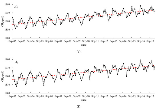 Atmospheric Infrared Sounder (AIRS) atmospheric CH4 concentration data between 2002 and 2018, shown as a black curve. Each dot is an observation or one month in the monthly AIRS data. The red, dashed line is a linear fit line. (a) A2, (b) A4, (c) A5, (d) A6, (e) A7, and (f) A8.