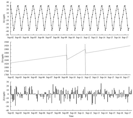 Parameters of S(t) shown in Figure 3a and θi (i = 1, 2, 3) are the coefficients of the sine and cosine terms, respectively. The unit for and θi is ppb. f is the frequency (once per year).