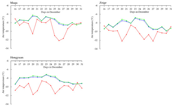 The daily temperature data of 16–31 December 2009 (red line), average 16–31 December temperature data between 2002 and 2018 (green line), and average 16–31 December temperature data without the 16–31 December 2009 temperature data (blue line) at the three meteorological stations at Maqu, Zoige, and Hongyuan.
