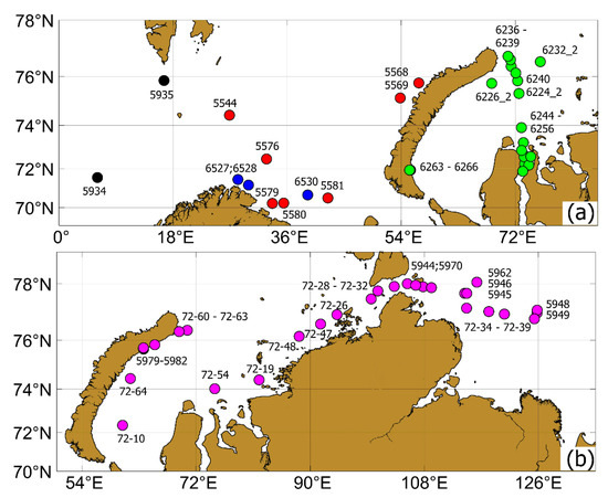 We focused on the Arctic seas, so for our analysis, we used data only for stations located north of the Arctic Circle; Figure 1 shows their location. The selection of stations for various types of research is elucidated in Section 3.