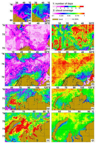 Distributions of the number of days with data per bin (a,c,e; scale 1) and cloud coverage according to OLCI_CLOUD flag data (b,d,f; scale 2). AMK-65: (a,b); AMK-68: (c,d); AMK-71: (e,f), AMK-72: (g,h), AMK-76: (i,j).