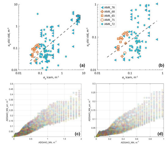 As we see in Figure 3b, even after excluding the above stations, the scatter of points is enormous. It is especially characteristic of the Kara Sea, where the difference between the ag_olci_std and ag_icam values can be more than 30-fold. Comparing Figure 3b,d, one can see that the real uncertainties are significantly (≥100%) higher than the calculated errors of the ADG443_NN_err (~10%).