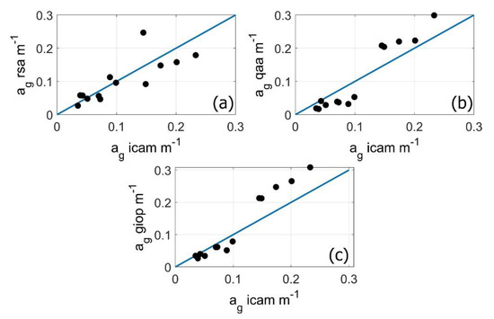 Figure 5 shows the regressions of the calculated values of ag_olci_std and ag_olci_C2RCC versus the measured values of ag_icam; Table 3 presents the regression parameters.