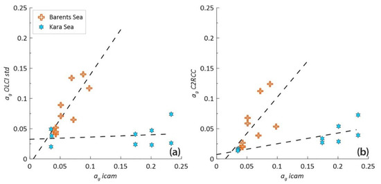 Regressions of satellite values ag_olci_std (a) and ag_olci_C2RCC (b) vs. measured values ag_icam. The dotted lines represent the correlations for the corresponding seas.