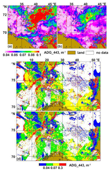 The Ob and Yenisei river runoff brings a large amount of dissolved organic matter into the Kara Sea, which significantly affects its bio-optical characteristics [18,19,20,21], especially in the shortwave bands, the visible range of satellite color scanners. Due to errors in atmospheric correction, the radiance reflectance of the water column in these spectral channels can even take negative values. That leads to difficulties in using some algorithms, for example, the Quasi-Analytical Algorithm [22]. For taking into account this feature, Vazyulya et al. [23] developed a regional algorithm for the Kara Sea that does not use the remote sensing reflectance values Rrs in the shortwave bands (the wavelengths <488 nm). This algorithm gives good results in the Kara Sea but can be applied to other seas as well. In the Barents Sea, coccolithophore blooms may interfere with standard algorithms for determining the ag values. The blooms occur in July–September and lead to a significant change in the spectral water-leaving radiance [3,4]. Not all algorithms cope with these changes. The solution to the atmospheric correction problem is beyond this work; our task is to assess the results of its application.