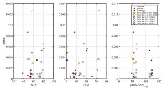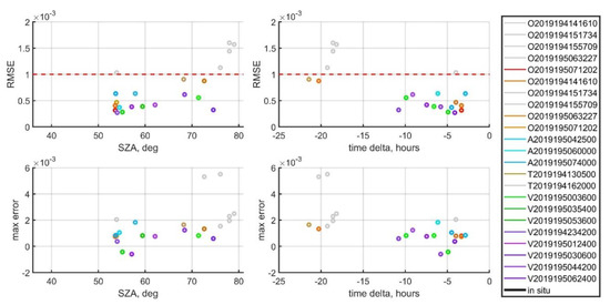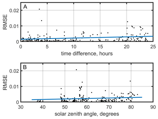 If we take the value of 0.02 m−1 as an absolute error for the ag_olci_std values, which is less than 0.1 m−1, and 20% as a relative error for the values exceeding 0.1 m−1, we must reject more than a half of the total number of pairs (Figure 3a). The main reason for the appearance of poor points is unsatisfactory atmospheric correction. In Section 3.2, we considered this problem in detail. As a parameter for analysis of the atmospheric correction errors, we used the values of the remote sensing reflectance Rrs. We built the dependences of the RMSE values on the time difference and from the solar zenith angle. Analysis of these dependencies allowed us to present the reasonable limitations of using the satellite Rrs spectra: RMSE ≤ 0.001. This value is not a strict requirement; at present, we consider it a reference point.