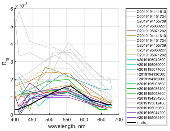 The software [38] allows us to process the Level 2 data from MODIS-Aqua, MODIS-Terra, VIIRS SNP, and VIIRS NOAA sensors. These data include the remote sensing reflectance Rrs and the diffuse attenuation coefficients Kd(490). Using the values of Rrs, the absorption coefficients of yellow substance ag and the particle backscattering coefficients [4] were calculated for the field stations where the time difference between satellite and field measurements was no more 24 h. Since the algorithms for these products were developed for MODIS color scanners, we interpolated the VIIRS Rrs to MODIS wavelengths. When calculating the parameters, the pixels flagged with LAND, CLDICE, SEAICE, and STRAYLIGHT were filtered out.