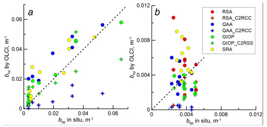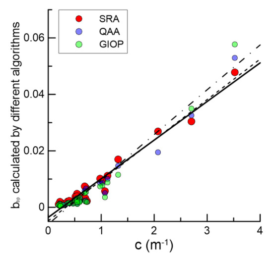 We used the spectral values of the absorption coefficient a(λ), measured by ICAM, and the backscattering coefficient determined as the sum of the scattering by the particles and pure water; the particle backscattering bbp was calculated from the in situ measured spectra Rrs(λ) using algorithm [49].