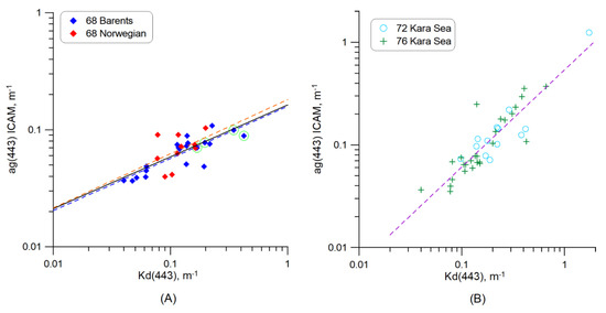 Table 8 presents the parameters of the regression between the values ag(443) and Kd(443). One can see a reasonably good correlation for the Kara Sea, with data from the AMK 72 and AMK 76 voyages: the coefficient of determination R2 = 0.73. We also obtained a high correlation (R2 = 0.72) for the Barents Sea, but the regression equations in these two seas differ significantly. The stations with coccolithophore blooms (see Figure 14A) fit well into the obtained regression. For the waters of the Norwegian Sea, there is no stable relationship between ag(443) and Kd(443): R2 = 0.21, but the resulting regression equation does not differ much from that obtained for the Barents Sea. The results obtained indicate the consistency of measurements of ag and Kd.