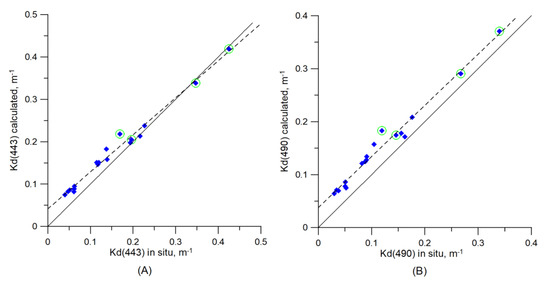 Scatterplot of the diffuse attenuation coefficient Kd for the wavelengths 443 (A) and 490 (B) nm calculated by formula [52], and from in situ measurements of underwater irradiance at 18 stations in the Barents Sea (AMK 68). Solid black line—perfect correspondence 1:1; dotted black line—linear regression. Green circles show the stations with coccolithophore blooms.
