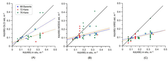 Scatterplot of the diffuse attenuation coefficient Kd(490) values calculated from field measurements and satellite data (standard algorithm, nearest pixel): (A) OLCI; (B) MODIS; (C) VIIRS. Solid black line—perfect correspondence 1:1; dotted blue line—the regression line for the Barents Sea, AMK 68; dotted red line—the Kara Sea, AMK 72, and 76. Green circles show the stations with coccolithophore blooms.