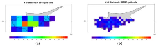 Figure 2 shows the number of stations that are distributed within the grid cells of each Satellite Precipitation (SP) dataset. The number of grid cells for the study area was 19 for the TRMM 3B43 data and 61 for IMERG data, respectively. On the one hand, the TRMM 3B43 grids show a notable variation of the available number of gauge stations residing (e.g., from 1 to 23 stations per grid cell). It should be also noted that 42% of the available gauge stations (57 of 136) were located within only three cells, although these 3B43 cells are not the ones with the maximum correlation with the corresponding gauge values. We notice that the distribution of the available gauge station within each IMERG grid cell was more balanced (1 to 5 stations per grid cell).