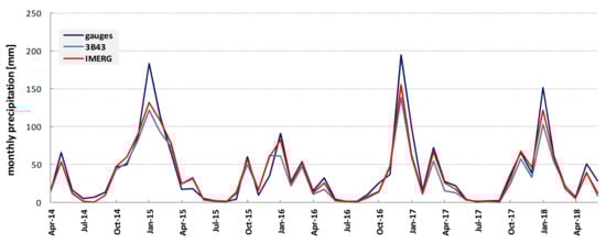 Average monthly values calculated for gauges (dark blue) TRMM 3B43 estimates (light blue) and IMERG estimates (red line) for the period April 2014 to June 2018.