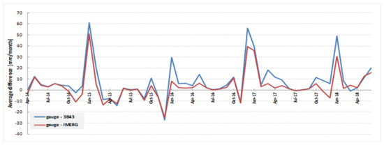 Average difference (monthly values) between gauge stations data from 3B43 (blue line) and IMERG (red line) estimates, respectively.