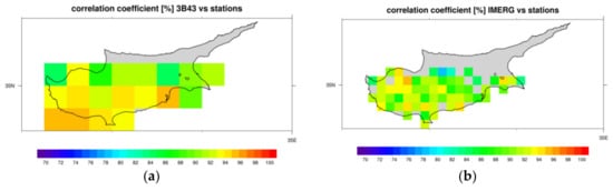 A study for a 30-year period (1981–2010) for the precipitation database Climate Hazards Group Infrared Precipitation with Station data (CHIRPS) in Cyprus was presented by Katsanos et al. [28]. The CHIRPS database was evaluated against gauge stations data. Results showed good correlation between monthly CHIRPS values and recorded precipitation with the correlation coefficients found to be around 0.85 and January the month with the highest correlation. The corresponding values for the annual mean ranged between 0.70 and 0.74, with the mountainous stations showing a slightly higher correlation.