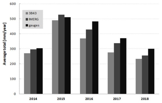 Mean annual values for the study period (see Figure 6) were calculated for both the set of 136 ground stations and the satellite precipitation products (mean values of the available corresponding grid cells within the study area). It is found that, overall, both SP data exhibit an underestimation, although it is lower for IMERG, with the exception of 2015, when a slight overestimation by the IMERG product was noticed. It should be noted, however, that the available precipitation estimates for 2014 were limited to the period April to December, while for 2018 they were limited to January to June.