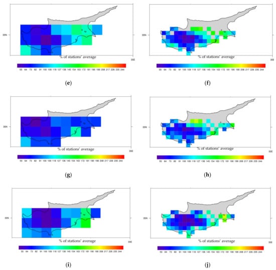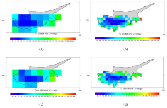Figure 7 displays the variation of overestimation (>100%) or underestimation (<100%) of annual precipitation values at each of the corresponding SP grid cell, between the SP estimated and calculated mean annual gauge station records. We notice that, more or less, the SP estimates have the same behavior regarding the overestimation/ underestimation of annual rainfall. Underestimation is more evident in the central area of Cyprus (greater area of Troodos mountain range), where higher precipitation records are generally noticed, highlighting the known limitations of satellite products regarding heavy rainfall, while the overestimation is noticed in the coastal or rather flat areas, where again the estimation of precipitation still remains a challenge due to the difficulty in distinguishing between rain and non-rain pixels over a complex background [44]. Furthermore, there are no significant differences between the years, since the cells that generally overestimate/underestimate rainfall have a similar performance regardless of the year.