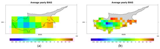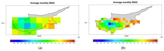 The monthly and annual spatio-temporal variations of bias for both satellite precipitation products for the study period are presented in Figure 8 and Figure 9, respectively, while the corresponding seasonal spatio-temporal variation is presented in Figure 10. It is clear that both SP products underestimate precipitation in higher elevation areas and overestimate in areas with lower elevation fluctuations. The underestimation is more evident in the winter.