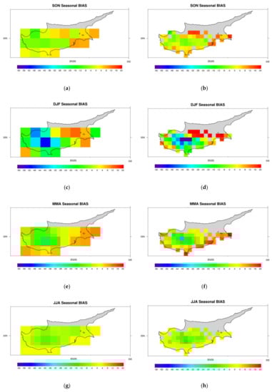 Seasonal bias for both precipitation products for the study period: (a) TRMM for September, October and November; (b) GPM for September, October and November; (c) TRMM for December, January and February; (d) GPM for December, January and February; (e) TRMM for March, April and May; (f) GPM for March, April and May; (g) TRMM for June, July and August; (h) GPM for June, July and August.
