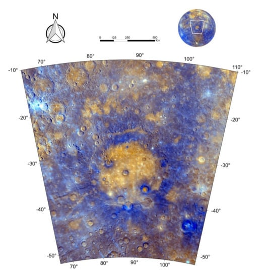The surface of Mercury, in particular, is well suited for carrying out mapping where color variations and color derived stratigraphy can be considered to be discriminant factors among geologic units. Throughout Mercury’s history, it has been shaped by impacts and volcanic resurfacing events [2,3,4,5,6,7,8,9,10], giving rise to a complex stratigraphy reflected by an outstanding color variegation on specific red, green and blue (RGB) color composites and a considerable variability in terms of surface composition [11,12,13,14,15,16].